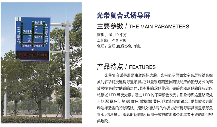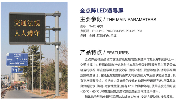 交通诱导屏主要作用:是交通指挥中心根据道路监控信息向汽车行驶员及时通报当前主要路段道路状况,方便其选择最佳路径行驶,减少道路堵塞。另一方面根据天气、交通设施检修、特殊车辆的行驶等情况,显示有关交通警示语、宣传口号、交通图形。提高驾驶员的警觉性,保障车辆的案例行驶。